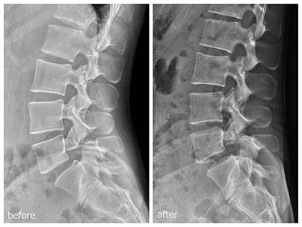 這應該是椎弓裂(vertebral cleft),比較一下調整前後的差異,還有、照片裏還透露了什麼樣的訊息?這樣是變好還是變差?很有趣的!順便猜猜看,這樣的歷程、需要多久的時間?