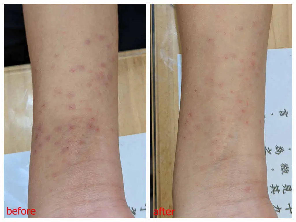 沒錯,這是小黑蚊(台灣鋏蠓)叮咬過的痕跡,沒想到在花蓮市耶?!居然這麼兇狠!這樣的皮膚狀況其實已經維持將近一週了,當然、人家不是為了這個問題來找我的,我也沒有刻意針對這個部份做額外的調整,但是、你怎麼解讀這個調整前後的差異呢?試著回答看看吧。